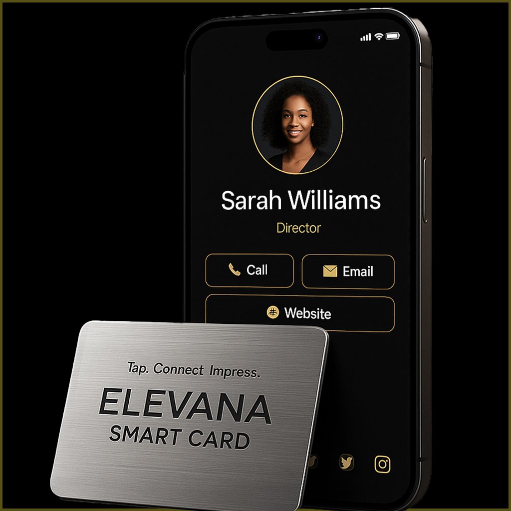 Elevana Smart Cards™ blend technology and design to help you share your professional or business profile in seconds — no apps, no printing, no limits.