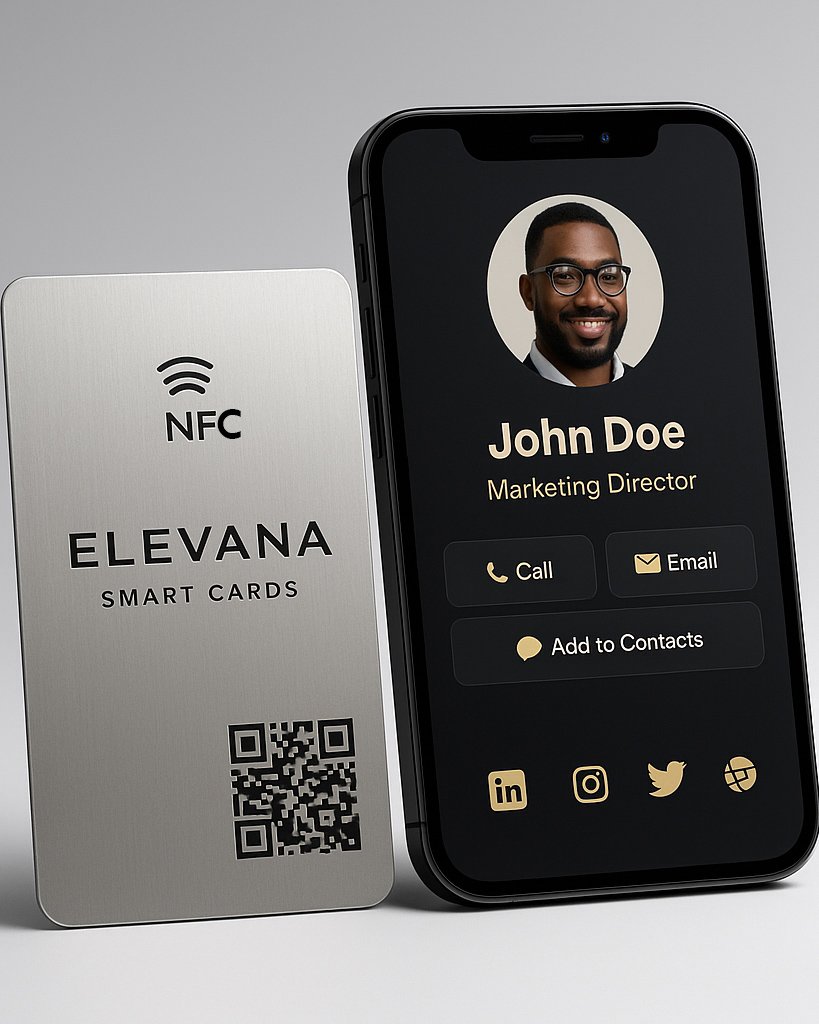 From brushed metal finishes to gold-accented digital profiles — each Elevana Smart Card is designed to make your brand unforgettable. These are examples of what your card could look like — sleek silver or matte black, a minimal design, possibly with your logo for “Elevana Creatives”.